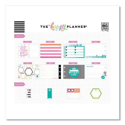 Stay productive. This Multi Accessory Pack is a great way to add some fun to your planner pages. Complete with stickers, sticky notes and prepunched cards, your planner spread will look super cute while being very productive. Three popular planner accessories in one place. 388 total pieces. For use with The Happy Planner®.Package Includes: (20) Double Sided Pre-Punched Cards; (20) Half Sheet Stickers; (3) Sticky Note Pads
