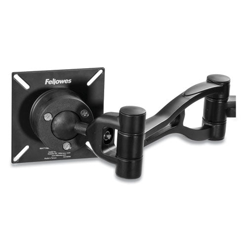 Features two monitor arms that adjust easily in every way. Easy to mount--clamp attaches to desktops 1" to 3" thick or through grommet holes at least 3 1/4” in diameter. Elevates monitors from 3 1/2" to 16 1/2" above the desk with a reach of 2 1/2"-27". Tilts up or down +/- 37 degrees and freely swings left or right (360° rotation capability). Each arm holds a flat monitor up to 24 lbs. Meets VESA mounting standards.Package Includes: Clamp; Attachment Hardware