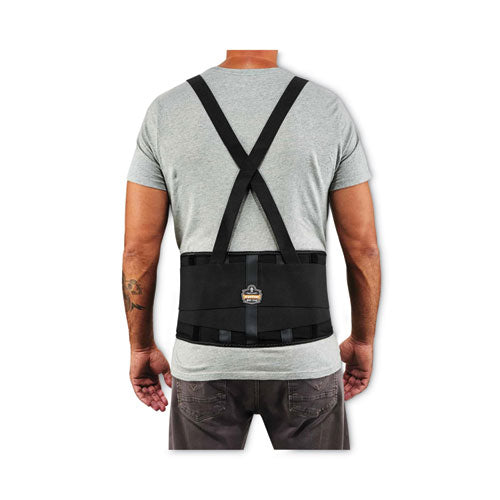 The ProFlex 100 Economy Spandex Back Support Brace is designed to remind workers of proper lifting techniques while also enhancing the body's intra-abdominal pressure, moving the stress away from the spine for back-pain relief. Durable, yet economic 280D spandex body provides reliable stretchability. Before lifting heavy objects, simply tighten the support belt to enhance the body's intra-abdominal pressure; and after lifting, just loosen the belt to achieve a wider range of motion. Secure-fit, interior rubber-track webbing prevents the belt from riding up when bending or lifting. Innovative Power Panel Positioners keep the tension bands close-to-hand, making it easy to get the desired level of tension. Non-conductive polypropylene stays help ensure long-lasting integrity. Adjustable, detachable suspenders allow the wearer to tailor the shoulder-fit to his or her unique needs. For best results, the support should fit snugly around the wearer's hips, with the front of the support two-fingers below the wearer's navel. When worn correctly, workers can easily maintain the proper posture for lifting, while achieving the extra support required to safely complete the task. Easy-to-use hook-and-loop closure keeps the belt securely fastened while in use. Brace can be worn over or underneath clothing. Machine washable—machine-wash cold and air dry.Note: This is a non-returnable item.
