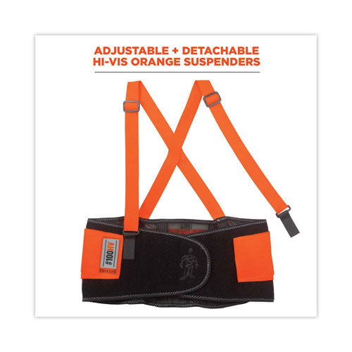 The ProFlex 100HV Economy Hi-Vis Spandex Back Support Brace is designed to remind workers of proper lifting techniques, while enhancing the body's intra-abdominal pressure to move stress away from the spine to minimize the potential for back-pain. Hi-vis orange panels help keep workers conspicuously visible. Durable, yet economic 280D spandex body is as comfortable as it is supportive. Ultra-flexible, stretchable bias binding features zig-zag stitching for enhanced strength. Before lifting heavy objects, simply tighten the support belt to enhance the body's intra-abdominal pressure; and after lifting, just loosen the belt to achieve a wider range of motion. Innovative Power Panel Positioners keep the tension bands close-to-hand, making it easy to get the desired level of tension. Secure-fit, interior rubber-track webbing prevents the belt from riding up when bending or lifting. Non-conductive polypropylene stays help ensure long-lasting integrity. Adjustable, removable shoulder straps keep the belt on standby until the next lift while allowing the wearer to tailor the shoulder-fit to his or her unique needs. For best results, the support should fit snugly around the wearer's hips, with the front of the support two-fingers below the wearer's navel. When worn correctly, workers can easily maintain the proper posture for lifting, while achieving the extra support required to safely complete the task. Easy-to-use hook-and-loop closure keeps the belt securely fastened while in use. Brace can be worn over or underneath clothing. Machine washable—machine-wash cold and air dry.Note: This is a non-returnable item.