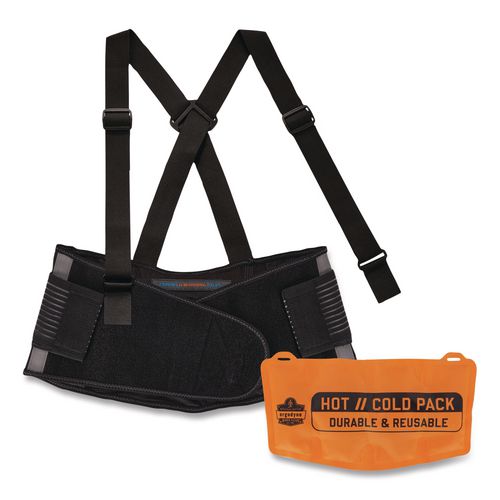 The ProFlex 1675 Back Support Brace not only promotes proper lifting techniques but also offers versatile hot/cold therapy. ProFlex back supports are designed to remind workers of proper lifting techniques while also enhancing the body's intra-abdominal pressure, moving the stress away from the spine for back pain relief. Featuring 480D spandex body material with a V-shaped design, this back support brace provides a firm level of support and also features mesh material on the backside for increased airflow. Rubber track webbing stays are sewn onto the interior to help keep support in position and prevent it from riding up. Included with each back support is a reusable cooling/warming pack for soothing pain relief. The pack can be activated in the fridge or freezer for cold therapy or warmed up in the microwave or boiled on stovetop for hot therapy. Cold therapy targets inflammation, swelling and muscle spasms, while heat therapy targets muscle pain and tension.Note: This is a non-returnable item.