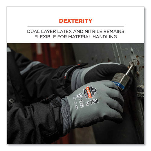 The ProFlex 7501 Coated Winter Work Gloves are dual layer for warm, waterproof protection in cold temperatures. Fully coated in latex to keep hands dry with a second, sandy nitrile palm dip for superior grip. A polyester liner with soft brushed acrylic fleece provides two levels of thermal protection. Wet hands are cold hands. These coated gloves feature a full waterproof latex dip that protects you from the elements by keeping water and cold air out, with a second layer of sandy nitrile on the palms for abrasion-resistance and enhanced grip without compromised dexterity. A double-lined interior, 15 g polyester topped with 10 g of brushed acrylic fleece, keep hands toasty and comfortable without bulk. These waterproof work gloves meet the EN 388:2131X standard for cut resistance. They are ideal for work in cold wet environments, including material handling and construction.Note: This is a non-returnable item.