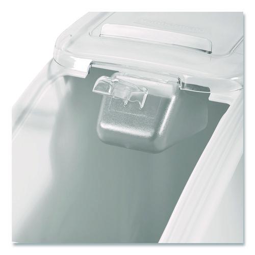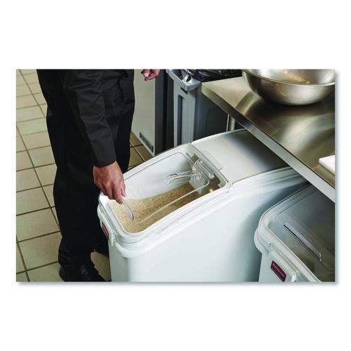 The Rubbermaid Commercial ProSave Ingredient and Food Storage Mobile Bin is a bulk food storage container on wheels. With a slanted front, sliding opening, and 32-ounce scoop, these food storage containers makes it easy to transport ingredients. These bulk food storage containers feature 2 fixed front casters and 2 swivel rear casters that provide superior maneuverability. The mobile bin has a white bottom and clear lid for easy identification of ingredients.Package Includes: Lid; 32 oz Scoop