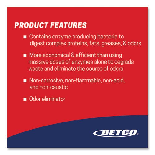 A stable liquid suspension of cultured bacteria and malodor counteractants capable of digesting complex protein, starch, fat, oil, grease, paper, vegetable gum, hair, and other organic waste. Probiotic bacteria continue to clean long after initial application. More economical and efficient than using massive doses of enzymes alone to degrade waste and eliminate the source of odors. This product is non-corrosive, non-flammable, non-acid, and non-caustic. Works with all FastDraw dispensing options.
