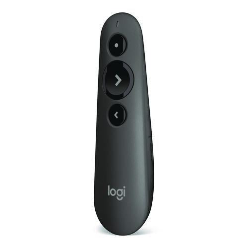 A plug-and-play presentation remote that allows you to navigate slides and laser point from up to 65 ft away. Deliver your presentation with ease and confidence thanks to the unmistakable three-button design and R500's comfortable, secure fit in hand. The R500 is optimized for most devices and popular presentation software and you can customize buttons, check battery life, and set an on-screen timer in the Logitech® Presentation App.Package Includes: (1) AAA Battery
