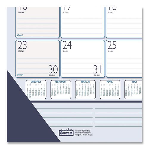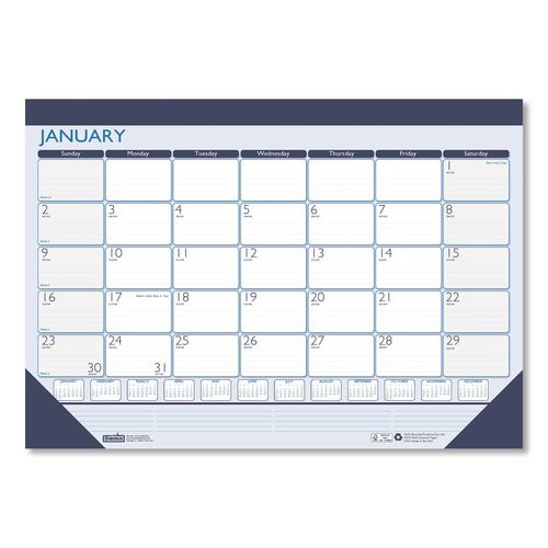 House of Doolittle recycled Contempo monthly desk pad calendar, 12 months January to December has soft colors and graphics that is pleasing to the eye. Full-year reference calendar aids in planning throughout the year. Large ruled daily blocks for neat notations provide plenty of note space. Also a handy note area across the bottom. Bound and perforated at the top with leatherette binding and two matching chipboard reinforced corners hold paper in place all year. Includes numbered weeks and Julian dates and dates remaining. Printed on recycled paper with soy-based inks.Note: This is a non-returnable item.