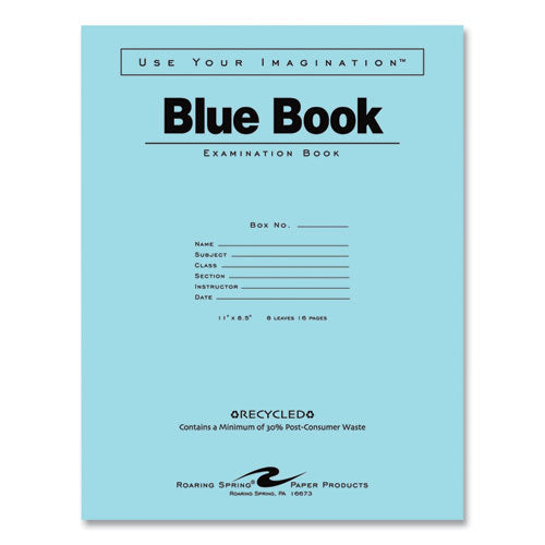 Founded in 1887 by D.M. Bare, Roaring Spring Paper Products has been an integral part of the Roaring Spring community for more that 130 years. Employing over 200 people, the company prides itself on remaining a family-owned, American small business. Use these booklets for exams, essays and short assignments. Each book is produced with recycled 15# white writing paper and has wide ruled blue horizontal lines with a red margin. The covers are made using recycled content as well. Two staples along the spine hold the book together. Each book has eight sheets (16 pages counting front and back).Note: This is a non-returnable item.