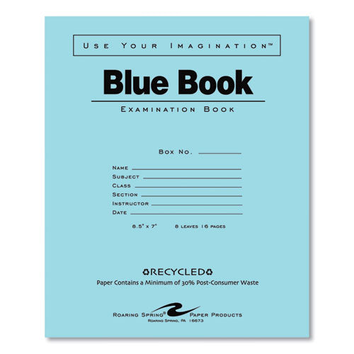 Founded in 1887 by D.M. Bare, Roaring Spring Paper Products has been an integral part of the Roaring Spring community for more that 130 years. Employing over 200 people, the company prides itself on remaining a family-owned, American small business. Use these booklets for exams, essays and short assignments. Each book is produced with recycled 15# white writing paper and has wide ruled blue horizontal lines with a red margin. The covers are made using recycled content as well. Two staples along the spine hold the book together. Each book has eight sheets (16 pages counting front and back).Note: This is a non-returnable item.