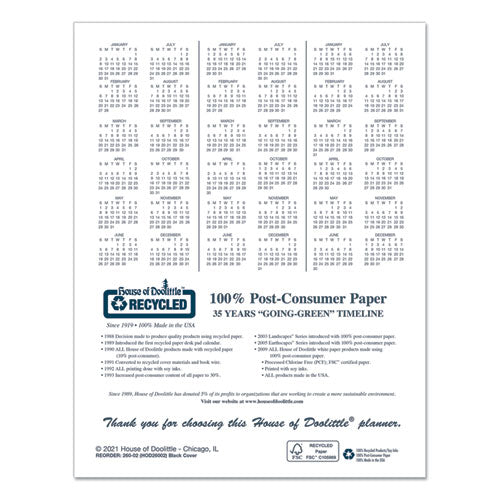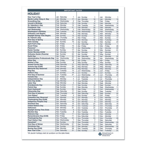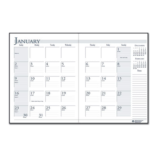Stitched-book-style flat planner, with room to record necessary appointments and general information, is ideal for the busy professional. One-month per two-page spread with generous note space for important information. Lightly ruled daily blocks help keep notations neat. Includes numbered weeks. Additional information sections include important holiday dates, a three-year reference calendar and a lined contact-information page. Made entirely of recycled materials.Note: This is a non-returnable item.