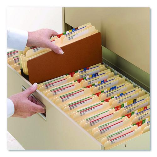 Active legal files, accounting tax files, financial printouts or bulky documents need the extra strength of a gusset fully lined with tear resistant material. Drop-front style allows easy access to bulky, frequently used files. Straight-cut tab provides large labeling area. Enclosed sides keep materials secure. Made of durable redrope stock. Available in a variety of expansions.