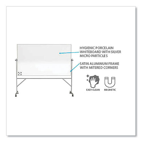 Reversible Magnetic Hygienic Porcelain Whiteboard with aluminum frame and stand is the perfect solution for high-touch, high-use environments where mobility is desired. The traditional functionality of a mobile, magnetic, reversible whiteboard combines with a clean, next-generation writing surface to take whiteboard performance to the next level. The porcelain-on-steel surface features embedded micro-silver particles that are slowly released over the lifetime of the product to protect it from bacterial and viral contaminants-contaminants are eliminated within 24 hours of contact. Scratch- and dent-resistant surface also ensures that your dry erase board never absorbs ink, eliminating the possibility of staining and ghosting. As the surface is magnetic, you can incorporate magnetic clips, characters and a variety of board accessories to accomplish any number of display and instructional goals. Strong aluminum frame and stand deliver reliable durability, and a robust, locking surface-reversing mechanism makes it easy to flip and set the chosen board surface in place. Twin-wheel swivel casters keep you mobile; and by making use of the two locking casters, you can keep the board stable where you intend to use it. Ships to you in Ghent's worry-free packaging, which is designed specifically for keeping mobile dry erase boards safe during shipping.Note: This is a non-returnable item.