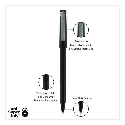 Stock your office, home or classroom with Roller Rollerball Stick Pens from uni-ball featuring strong, long lasting tips. These rollerball pens deliver the silky-smooth glide of a fountain pen without smudging for effortless writing. Roller pens produce neat and precise lines for intricate writing, making it easy to create super fine details in your drawings and diagrams. Capped roller pens are useful for a variety of tasks from note taking to signing checks and legal documents to uniquely embellishing fun and creative writing projects. Innovative uni Super Ink technology forms a strong bond with the paper, protecting from water, fading and fraud. Made from recycled material.