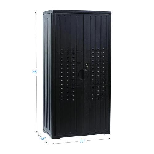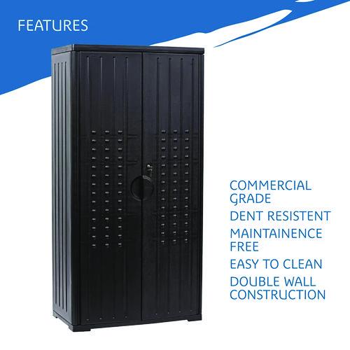 Durable, double-walled construction is resistant to dents, scratches, stains, chemicals and corrosion. Locking doors keep your storage space secure. Ergonomic handles are recessed for easy use. Made with tough, high-density blow-molded polyethylene. Easy assembly with minimal tools.