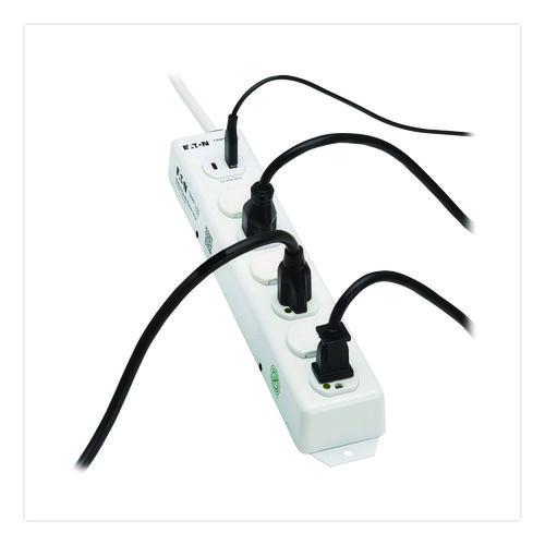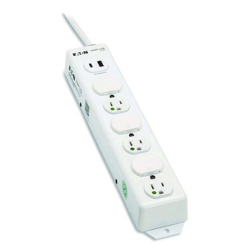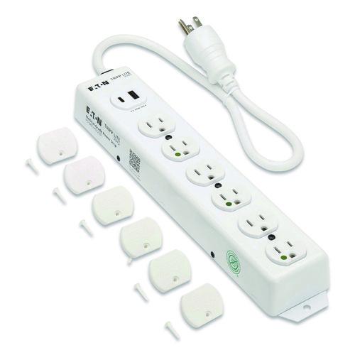 Features six NEMA 5-15R-HG hospital-grade outlets that supply power to equipment used in areas outside patient care vicinities, including nursing stations, pharmacies, office and administration areas and labs. This power strip has a NEMA 5-15P-HG "green dot" plug and meets UL 1363 standards. One USB-A port and one USB-C Power Delivery (PD) port let you charge smartphones, tablets and other vital mobile devices. The USB-C PD port provides up to 30 W. The Safe-IT power strip is protected by an antimicrobial coating that helps resist the growth of bacteria, viruses, fungi, mold and mildew. With no central power switch, this power strip presents no danger of accidental shutoff and cutting off power to essential devices. Locking plastic safety covers are included to block access to unused outlets. The two-foot cord connects the power strip to a standard NEMA 5-15R wall outlet. Built-in mounting flanges let you mount the all-metal housing to a stable, flat surface. Scan the Easy Asset QR code on the side of the power strip to access product resources and other critical information.