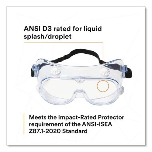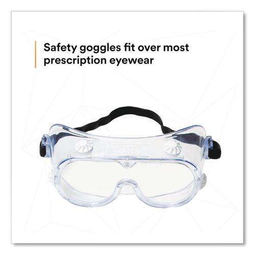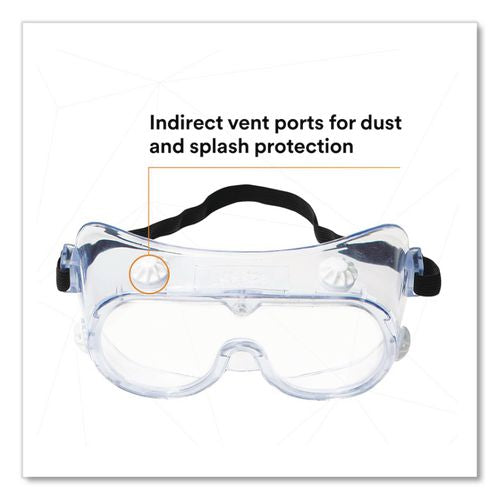 These safety splash goggles are a dependable and economical choice that offer a sturdy polycarbonate lens, adjustable elastic strap and a wide opening to fit over prescription eyewear. Indirect venting system circulates air and helps minimize fogging, allowing for use in varied environments and conditions.