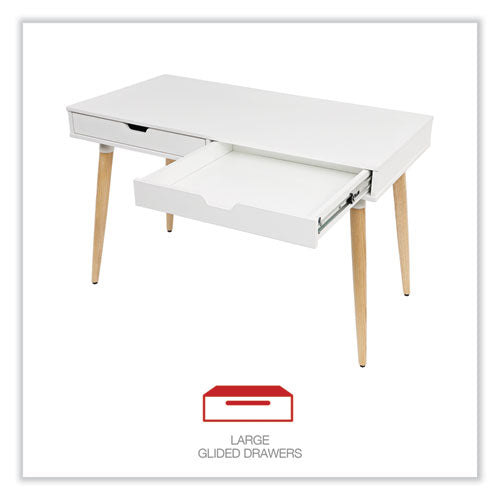 Scandinavian writing desk is a simple and modern working desk that's ideal for working or studying. The multi-function desk is constructed with a durable, white laminate top and beige wood-colored, angled, wood legs. The wide, smooth work surface allows you to manage multiple tasks at once such as working on a computer and taking notes. The desk includes two large, glided drawers which provide optimal storage. Designed with a clean look that takes up minimal space on the floor and fits the décor of most spaces. Some assembly is required.