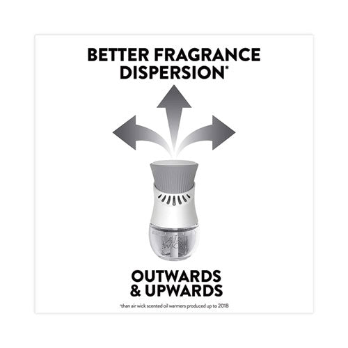 Leave a lasting impression on guests and ensure a consistent experience with Air Wick Scented Oil Refills with Essential Oils. Keep supply rooms stocked with the pleasant scents your guests come to associate with your business. Get up to 60 days per refill, on the lowest warmer setting, of natural-smelling fragrance with essential oil-infused formulas. Easily refill the Air Wick plug-in warmer by unscrewing the cap and inserting the refill until it clicks. Adjust the warmer settings to ensure the optimal fragrance for each room. Enhance entrances, common areas, offices, breakrooms and guest rooms with pleasant scents.
