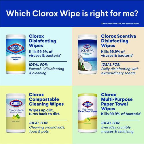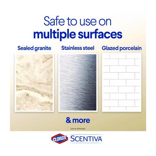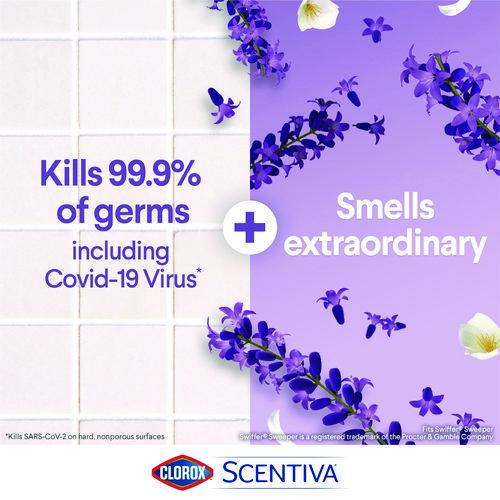 Clean and disinfect your home while enjoying a captivating, long-lasting scent with these bleach-free , all-in-one cleaning wipes. Clorox Scentiva Disinfecting Wipes kill 99.9% of viruses and bacteria, including the COVID-19 Virus, in 15 seconds on hard, non-porous surfaces when used as directed with the power of Clorox clean. These multi-surface cleaning wipes feature a clear-drying formula that powers through grease, soap scum and grime, so you can tackle any surface with confidence. Clorox Scentiva Disinfecting Wipes even prevent bacteria growth for up to 24 hours. Safely wipe down garbage cans, sinks, toys, remotes and appliances, or clean up car spills with these non-bleach sanitizing wipes.
