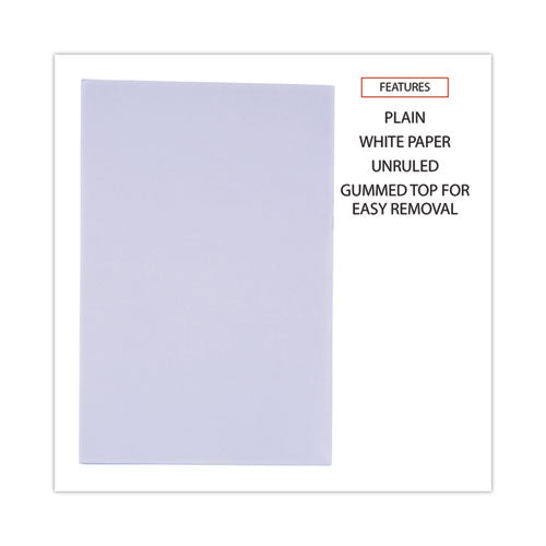 Plain, unruled, white paper pads with a gummed top and cardboard backing. The scratch pads are ideal for taking quick notes at home, the office, school, or on-the-go. Each sheet tears out cleanly and easily without leaving any residual paper tears or glue, even when torn from the center of the pad. Convenient size fits into a small bag or purse.