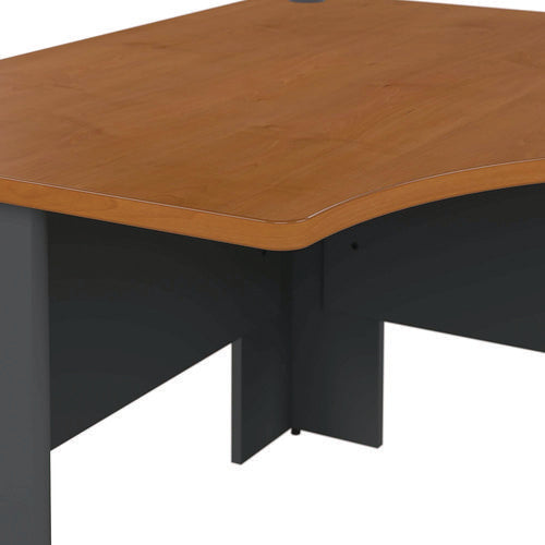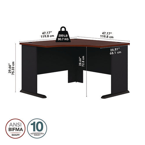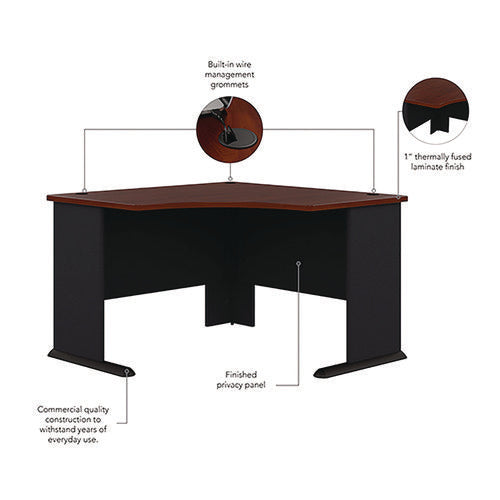 Series A Collection 48W Corner Desk is designed with a versatile C-Leg table design which permits easy configurations. Constructed with 100% thermally fused laminate for durability and superior resistance to scratches and stains. Use the 48W Corner Desk to connect Credenzas and Desks to expand your desk design. You'll enjoy the integrated wire management located within both desktop and leg grommets to conceal cables to keep your desk area uncluttered. Sturdy molded ABS feet include adjustable levelers to compensate for uneven floors.Note: This is a non-returnable item.