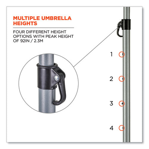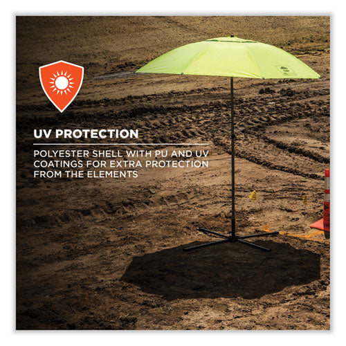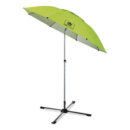 The SHAX 6199 Lightweight Work Umbrella + Stand Kit provides quick and portable relief from the elements to increase worker productivity and reduce weather-related delays. Kit includes one 6100 Industrial Lightweight Umbrella and one 6190 Umbrella Stand for securely anchoring the umbrella without using stakes. Engineered with a powder-coated steel frame, a reinforced weatherproof canopy and 300D polyester, this lightweight umbrella is built to withstand harsh elements. The unique tilt-top feature allows users to shade themselves from harmful UV rays at any hour of the day. The bright lime vented top enhances airflow and visibility, making this a great construction umbrella for scorching hot jobsites. The polyester shell features protective PU and UV coatings for shelter from sun and rain. This heavy-duty umbrella is the ideal solution for keeping workers dry and protected from the sun on a variety of worksites. Also great for outdoor recreational activities.Package Includes: (1) 6100 Umbrella; (1) 6190 Umbrella StandNote: This is a non-returnable item.