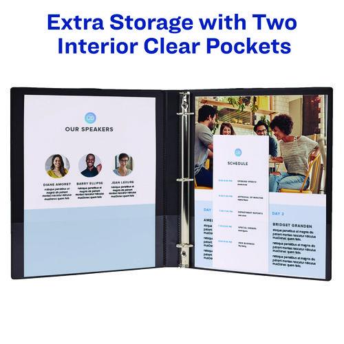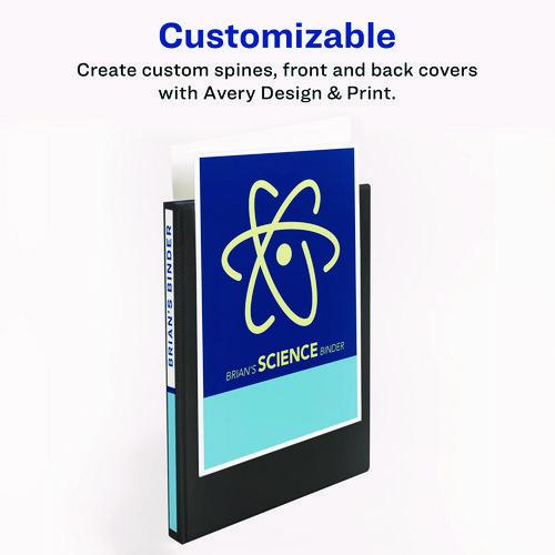 Keep your binder organization simple yet secure in a slim and convenient package with Avery Showcase View Binders with slant rings. The sturdy, lightweight construction ensures that the binder is up for light, general use and is perfect for school supplies, office supplies and more. Show off your class notes, employee handbooks and other important papers in a lower cost economy binder that provides a high-quality look and feel. Covered in a deep texture film that offers a smooth finish and linen-like pattern, these binders with clear covers work well at hiding surface damage from normal, everyday use. Each binder holds 8.5" x 11" paper, sheet protectors and dividers. The back-mounted slant rings keep your pages lying flat and easy to turn. Store loose sheets within the two interior pockets on the front and back covers of the binder. Personalize your binders and make the contents easy to identify at a glance with custom title pages for your front and back covers and matching ID label on the spine. Customizing your binder is easy when you use the designs and templates in Avery Design and Print. Great for use as a report binder, project binder, portfolio binder, presentation binder, recipe binder and more.