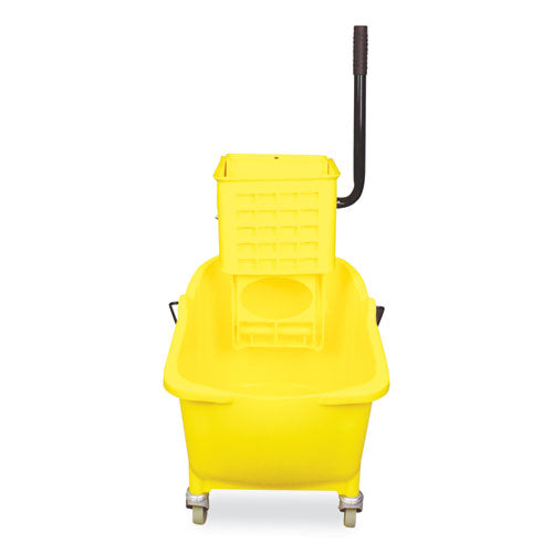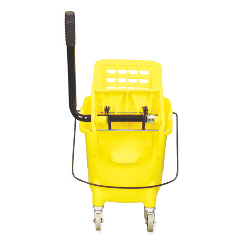A higher back for comfortable wringing with lower front for reduced back strain. The large capacity side-press/squeeze wringer accommodates mops from 12 to 32 oz. Embossed, permanent graduation marks make for convenient measuring of water and solution.