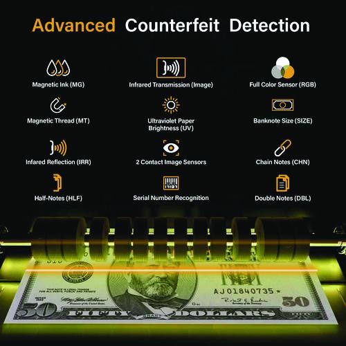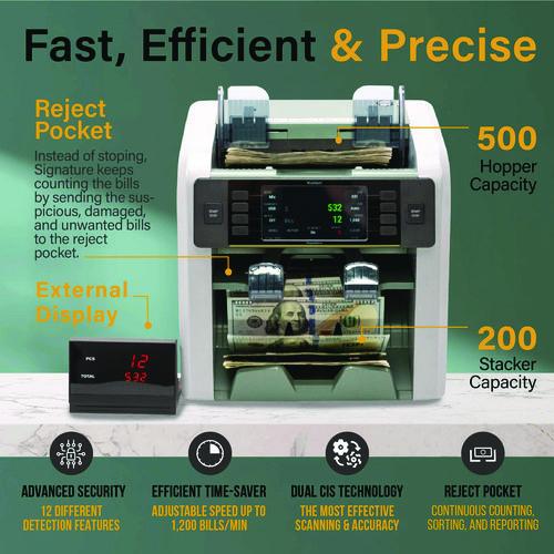 A two-pocket retail-ready solution for counting and sorting the cash your business generates. The Kolibri Signature™ will guarantee your cash counts are correct while vastly improving productivity. Unlike most money counters, the Signature™ is able to read a mixed stack of bills as it's fed through and automatically determine what denomination it is ($1, $2, $5, $10, $20, $50 and $100 bills). The two-pocket ensures that a suspect bill, incorrect denomination or face are sorted out into a reject pocket for non-stop counting or sorting. The Kolibri Signature includes a built-in printer, a wide variety of counting modes, a user-friendly interface and a large LCD display that provide a unique experience to speed through end-of-day settlements, till set-ups and more. Built to last and power through large amounts of cash quickly. Featuring three adjustable bill counting speeds of 800, 1,000 or 1,200 bills per minute provide flexibility based upon the state of the bills to be counted, slower speeds are great for worn bills while faster speeds will sail through crisp new bills. The extra-large hopper holds up to 500 bills at once. For high-performance currency counting and sorting, make Signature™ the one choice for your business.Note: This is a non-returnable item.