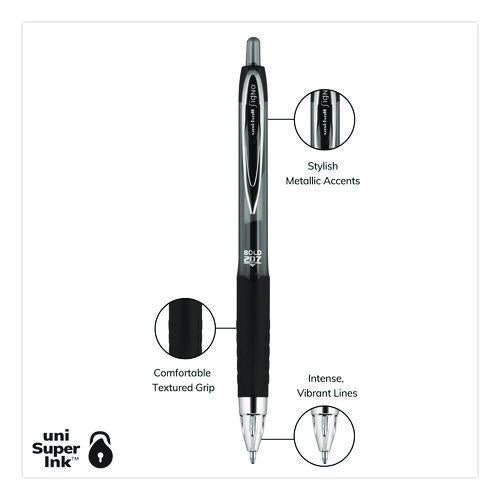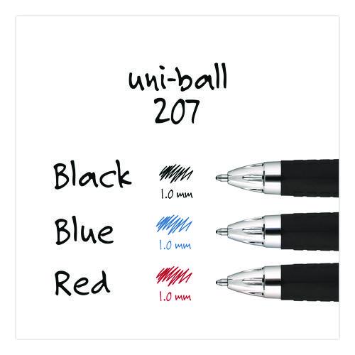 Stock your office, home or classroom with 207 Retractable Gel Pens from uni-ball with a stainless steel tip that resists bending and breaking. Even-flowing, pigment-based gel ink delivers a smooth writing experience for intense, vibrant lines, ensuring that every mark is brilliantly communicated. Use these retractable gel pens for everyday writing tasks, check signing and all of your important signatures, trusting its quick-drying uni Super Ink. Innovative uni Super Ink technology effectively entraps the gel ink into the paper, producing fraud, fade and water-resistant documents that resist check washing or bleaching. A textured grip offers greater comfort and control as you continue writing, while a translucent ink window indicates the level of gel ink remaining, so you don't run out unexpectedly. The sleek design of the 207 with modern metal accents gives the retractable gel pen a stylish touch.