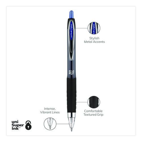 Stock your office, home or classroom with 207 Retractable Gel Pens from uni-ball with a stainless steel tip that resists bending and breaking. Even-flowing, pigment-based gel ink delivers a smooth writing experience for intense, vibrant lines, ensuring that every mark is brilliantly communicated. Use these retractable gel pens for everyday writing tasks, check signing and all of your important signatures, trusting its quick-drying uni Super Ink. Innovative uni Super Ink technology effectively entraps the gel ink into the paper, producing fraud, fade and water-resistant documents that resist check washing or bleaching. A textured grip offers greater comfort and control as you continue writing, while a translucent ink window indicates the level of gel ink remaining, so you don't run out unexpectedly. The sleek design of the 207 with modern metal accents gives the retractable gel pen a stylish touch.