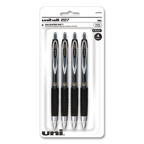 Stock your office, home or classroom with 207 Retractable Gel Pens from uni-ball with a stainless steel tip that resists bending and breaking. Even-flowing, pigment-based gel ink delivers a smooth writing experience for intense, vibrant lines, ensuring that every mark is brilliantly communicated. Use these retractable gel pens for everyday writing tasks, check signing and all of your important signatures, trusting its quick-drying uni Super Ink. Innovative uni Super Ink technology effectively entraps the gel ink into the paper, producing fraud, fade and water-resistant documents that resist check washing or bleaching. A textured grip offers greater comfort and control as you continue writing, while a translucent ink window indicates the level of gel ink remaining, so you don't run out unexpectedly. The sleek design of the 207 with modern metal accents gives the retractable gel pen a stylish touch.
