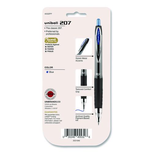 Stock your office, home or classroom with 207 Retractable Gel Pens from uni-ball with a stainless steel tip that resists bending and breaking. Even-flowing, pigment-based gel ink delivers a smooth writing experience for intense, vibrant lines, ensuring that every mark is brilliantly communicated. Use these retractable gel pens for everyday writing tasks, check signing and all of your important signatures, trusting its quick-drying uni Super Ink. Innovative uni Super Ink technology effectively entraps the gel ink into the paper, producing fraud, fade and water-resistant documents that resist check washing or bleaching. A textured grip offers greater comfort and control as you continue writing, while a translucent ink window indicates the level of gel ink remaining, so you don't run out unexpectedly. The sleek design of the 207 with modern metal accents gives the retractable gel pen a stylish touch.