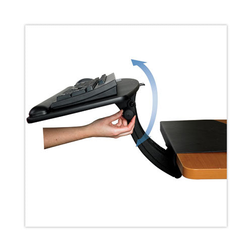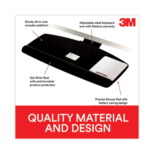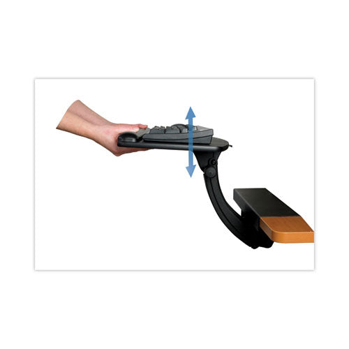 Increase comfort and productivity by placing your keyboard and mouse at a proper level. This keyboard has a sit/stand easy adjust arm which provides height adjustment to 10" above mounting surface and 4" below mounting surface allowing you to alternate between sitting and standing positions. Tilt is adjusted by dialing tilt knob to desired angle. Sturdy platform has proprietary lateral adjustments for getting the keyboard exactly where you want it and an all-in-one platform with wooden construction to minimize bouncing. Articulating mousing platform adjusts in all directions, tilts forward and back, and can be mounted on the right or left side of the keyboard platform. Includes leatherette gel wrist rest with antimicrobial product protection for keyboard and mouse and a Precise™ Mouse Pad that can be placed to the left or right of the keyboard.Package Includes: Keyboard Tray with 23" Track; Gel-Filled Wrist Rest; 3M™ Precise™ Mouse Pad with Battery Saving Design