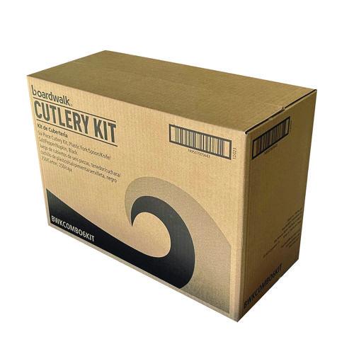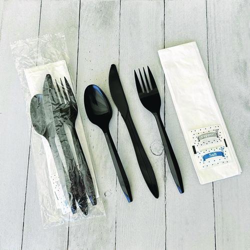 Six-Piece Cutlery Kit, Mediumweight, Fork/Knife/Napkin/Pepper/Salt/Spoon, 5.86", Plastic, Black, 250/Carton