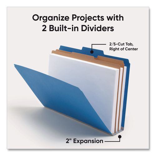 Six-Section Pressboard Top Tab Classification Folders, Six SafeSHIELD Fasteners, 2 Dividers, Legal Size, Dark Blue, 10/Box