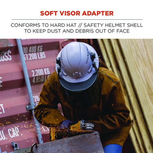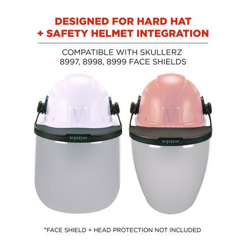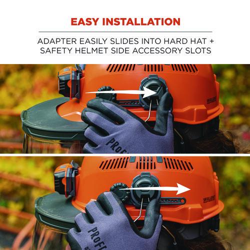 The Skullerz 8996 Face Shield Adapter Frame Replacement securely attaches to Skullerz Hard Hat and Safety Helmet side accessory slots and accepts 8997 Cap-Style Hard Hat & Safety Helmet Face Shields, 8998 Full Brim Hard Hat Face Shields and 8999 Mesh Face Shield Replacements for full face protection on the jobsite. When securely installed, this safety face shield has three pivoting positions-fully down to provide full face protection, mid-way, or fully up and out of the way. The adapter can be adjusted forward or backward to accommodate other hard hat accessories such as headlamps. Integrated accessory slots on the face shield adapter allow users to attach Skullerz Earmuffs when face shield is installed and in use.Note: This is a non-returnable item.