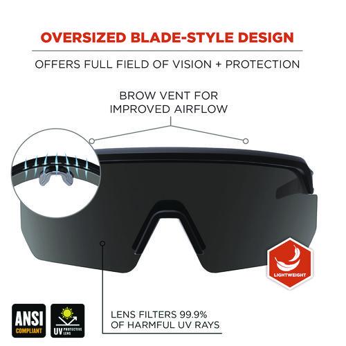 Skullerz AEGIR Anti-Scratch and Enhanced Anti-Fog Safety Glasses feature an oversized blade-style design to provide superior eye protection and maximized field of vision. These protective safety glasses feature tough scratch-resistant and anti-fog polycarbonate lenses to protect against impacts and filter 99.9 percent of harmful UVA, UVB and UVC rays. The high-strength frame is built for durability and the rubberized nose bridge and temples offer non-slip security and resist sweat for all-day comfort. To provide a custom fit, the rubber temples can be easily bent and re-bent to accommodate a variety of head shapes and fit preferences. Impact resistant.Note: This is a non-returnable item.
