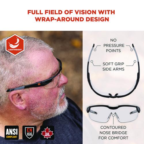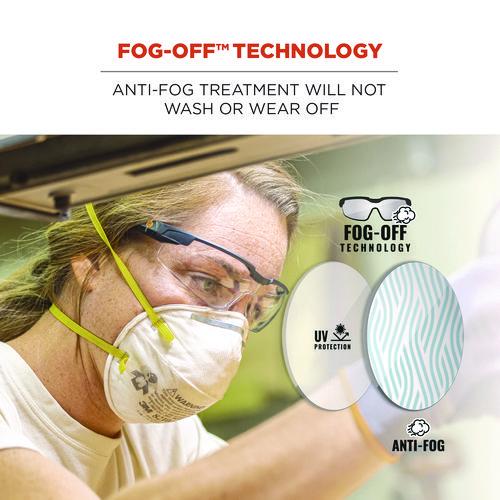 Skullerz DELLENGER Anti-Fog Safety Glasses feature adjustable temples that shift up or down and lock into place for a custom fit on a variety of face sizes. These safety glasses feature tough anti-fog polycarbonate lenses to protect against impacts and filter 99.9 percent of harmful UVA, UVB and UVC rays. The rimless design makes for a lightweight and comfortable fit and maximizes a full field of vision. A contoured nose bridge won't slip or pinch and the flex-fit temples reduce pressure and provide stay-put all-day comfort. The lens features Fog-Off technology for durable scratch-resistance that won't wash off or wear off for fog-free viewing no matter the task.Note: This is a non-returnable item.