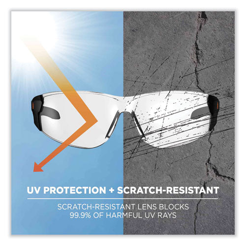 Skullerz® Saga Frameless Safety Glasses are lightweight, protective z87 safety glasses with tough scratch-resistant lenses that filter 99.9 percent of harmful UVA, UVB and UVC rays to keep your eyes safe in the sun. A sleek and sporty frameless design offers a wide field of vision, while a variety of lens options can be matched to your specific task and light environment. It's everything you've come to expect from Skullerz® Eye Protection at an outstanding value. The clear frame design maximizes the field of vision. These impact-resistant safety glasses offer high-velocity impact protection.Note: This is a non-returnable item.
