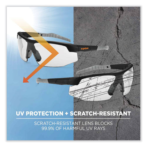 The Skullerz® Skoll Safety Glasses are named after the Norse Wolf God of Sun and Moon. These protective work safety sunglasses feature tough scratch-resistant lenses filter 99.9 percent of harmful UVA, UVB and UVC rays to keep your eyes safe in the sun. The blade-style design is a sleek and sporty look with all the features you've come to expect from Skullerz® Eye Protection at an outstanding value. The durable frames bend and flex without breaking. Flexible rubber temples and non-slip nose piece offer a non-slip, comfortable fit. These impact-resistant safety glasses also offer high velocity protection.Note: This is a non-returnable item.