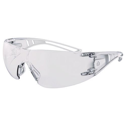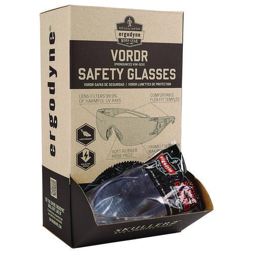 Skullerz VORDR Frameless Safety Glasses are the lightest weight safety glasses in the Skullerz Eye Protection line. Featuring polycarbonate lenses, these safety glasses protect against impacts and filter 99.9 percent of harmful UVA, UVB and UVC rays. The wrap-around rimless design maximizes a full field of vision, while a soft and adjustable nose piece offers all-day comfort. The flex-fit temples will not slip or pinch and their low-profile, flat design makes them compatible with hearing protection accessories. These safety glasses are dielectric, meaning that they are not made with any metal parts or pieces, making them non-conductive. VORDR impact-resistant safety glasses are tested to ANSI/ISEA Z87.1-2020 High-Velocity Impact Protection and optical requirements which is the US standard for Personal Eye and Face Protection Devices and is listed on the frame (Marks: Z87.1+). These UV protection glasses are great for protecting your eyes during outdoor work like construction, carpentry/woodworking, welding or landscaping. Also great for outdoor hobbies like boating, skiing, fishing, hunting/shooting, sports and more. Every day, approximately 2,200 workers suffer from eye injuries that require medical treatment, and of those injured workers, three out of five of them were not wearing their safety glasses. And over 100 of those instances require time away from work. Skullerz Safety glasses are a stylish and inexpensive way to protect your eyesight.Note: This is a non-returnable item.