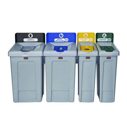 Kit offers an adaptable recycling solution to fit any commercial facility's recycling needs. The station features color-coded lids and billboards, stream-specific openings, labeling with intuitive icons and verbiage to help patrons and staff sort recyclables with ease. Each stream station connects without the use of hardware or tools for easy assembly. The durable connector snaps into place, securely holding the containers together. The containers feature bag cinches, eliminating the need to tie knots to secure liners and venting channels, making it easier to remove full liners. The sleek design fits seamlessly into front-of-house spaces like lobbies and breakrooms.