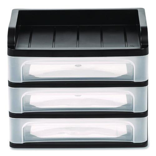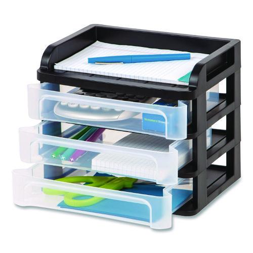 Add extra storage to your office with this desktop drawer system. The three pullout drawers and top tray hold small desktop and household supplies, making it easy to organize all your essentials. Each drawer features clear plastic construction, so you can see the items stored inside. Its compact size takes up minimal space on a desk, shelf or credenza.