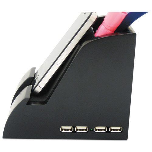 Designed to fit any smartphone, e-reader, or tablet, the Smart Charge Pencil Cup keeps your device handy, while keeping pens, pencils and other utensils close at hand. Angled front provides an excellent ergonomic viewing platform for any size mobile device. Includes four USB ports to charge your phone or connect to your computer allowing data transfer from flash drives, phones and other devices. Access channels under the base keep cables in place while the rear cord keeper stores extra cable out of sight. Powered by either a DC 5V adapter (not included) or USB Mini cable (included) connection to computer. Features soft pad backing to prevent scratches and rubber feet for stable operation. Wood construction, black matte finish, and sleek styling.Package Includes: 6 ft Mini USB Cable
