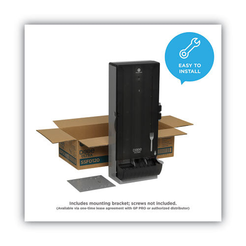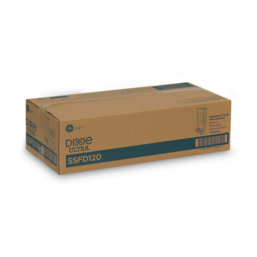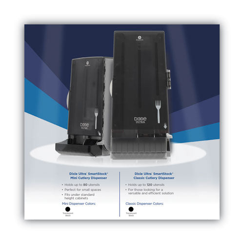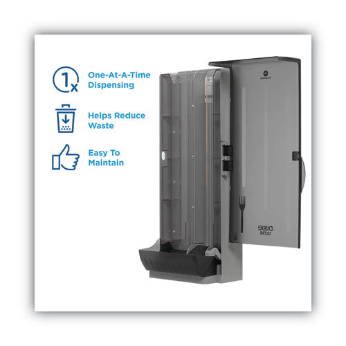 Dispenser holds up to 120 utensils. Promotes good hygiene - enclosed design protects cutlery from contaminants. Reduces inventory usage by up to 25% - utensils are dispensed one at a time. Speeds up restocking - just load the refill, insert, rip, pull and you're done in seconds. Frees up valuable counter space - sized just right to keep things looking neat and organized. Gives you greater efficiency - a clean and simple alternative to open cutlery bins.