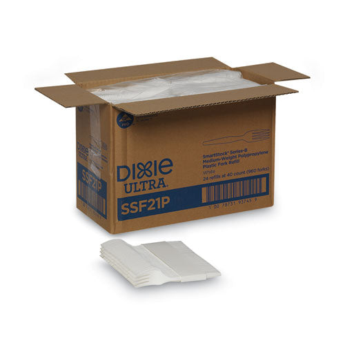 Pre-counted refill packs make restocking efficient and easy. For use with select SmartStock® Cutlery Dispensers (sold separately). Sturdy cutlery provides reliable service. Sleek and efficient, Dixie Ultra® SmartStock® Plastic Cutlery Refills are ideal for Dixie Ultra® SmartStock® Dispensers.Package Includes: (24) Packs of 40 Forks
