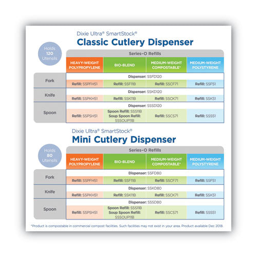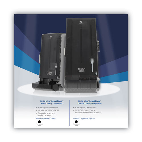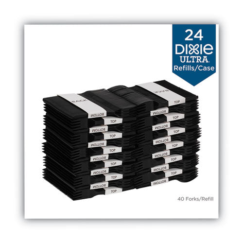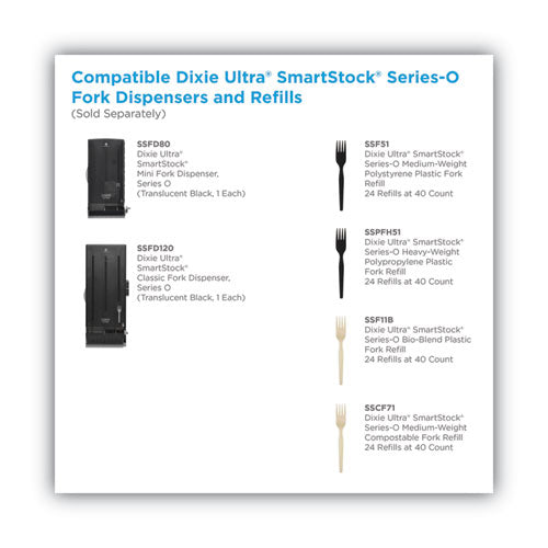 Pre-counted refill packs make restocking efficient and easy. For use with select SmartStock® Cutlery Dispensers (sold separately). Sturdy cutlery provides reliable service. Sleek and efficient, Dixie Ultra® SmartStock® Plastic Cutlery Refills are ideal for Dixie Ultra® SmartStock® Dispensers.Package Includes: (24) Packs of 40 Forks
