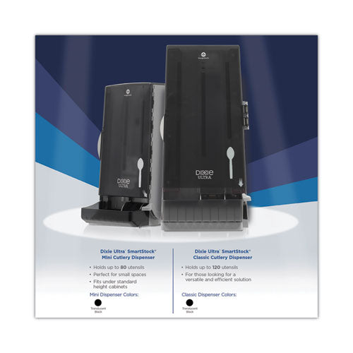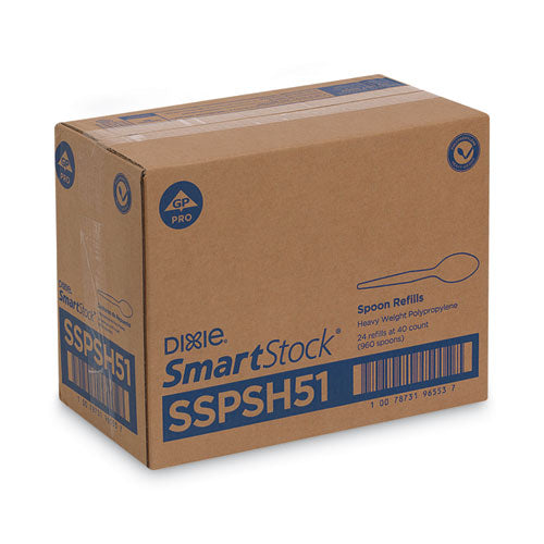 Pre-counted refill packs make restocking efficient and easy. For use with select SmartStock® Cutlery Dispensers (sold separately). Sturdy cutlery provides reliable service. Sleek and efficient, Dixie Ultra® SmartStock® Plastic Cutlery Refills are ideal for Dixie Ultra® SmartStock® Dispensers.Package Includes: (24) Packs of 40 Spoons