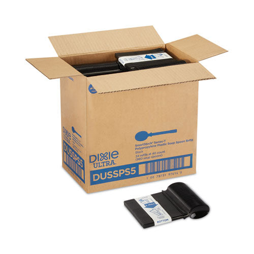 These pre-counted and pre-assembled refills make it fast and easy to restock an empty dispenser. Just pick up a new cutlery refill, slide it into the dispenser, grasp the pull tab and pull away the paper band, close the door and you're done. It's really that simple! Sleek and efficient, Dixie Ultra® SmartStock® Disposable Plastic Cutlery Refills are ideal for Dixie Ultra® SmartStock® Tri-Tower Dispenser.Package Includes: (24) Packs of 40 Soup Spoons