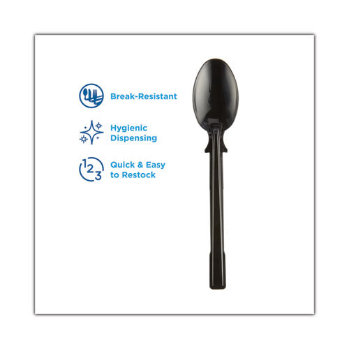 These pre-counted and pre-assembled refills make it fast and easy to restock an empty dispenser. Just pick up a new cutlery refill, slide it into the dispenser, grasp the pull tab and pull away the paper band, close the door and you're done. It's really that simple! Sleek and efficient, Dixie Ultra® SmartStock® Disposable Plastic Cutlery Refills are ideal for Dixie Ultra® SmartStock® Tri-Tower Dispenser.Package Includes: (24) Packs of 40 Teaspoons